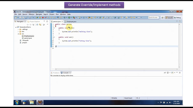 public class Employee extends person { @Override public void walk() { // TODO Auto-generated method stub super.walk(); } @Override public void eat() { // TODO Auto-generated method stub super.eat(); } @Override public String toString() { // TODO Auto-generated method stub return super.toString(); } }