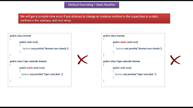 public class Animal { public static void run() { System.out.println("Animal runs slowly"); } } class Tiger extends Animal { public static void run() { System.out.println("Tiger runs fast."); } }