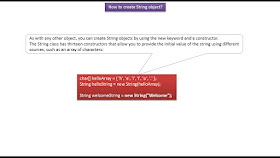 public class StringTest { public static void main(String[] args) { String greeting = "Hello world"; System.out.println("greeting = " + greeting); char[] helloArray = { 'h', 'e', 'l', 'l', 'o', '.' }; String helloString = new String(helloArray); System.out.println("helloString = " + helloString); String welcomeString = new String("Welcome"); System.out.println("welcomeString = " + welcomeString); } }