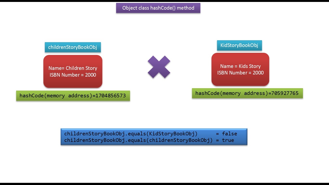 Outputpublic class ObjectClassTest { public static void main(String[] args) { Book childrenStoryBookObj = new Book("Children Story", "2000"); Book KidStoryBookObj = new Book("Kids Story", "2000"); System.out.println("childrenStoryBookObj.hashCode() = " + childrenStoryBookObj.hashCode()); System.out.println("KidStoryBookObj.hashCode() = " + KidStoryBookObj.hashCode()); /* * The equals() method provided in the Object class * uses the identity operator (==) to determine * whether two objects are equal. * * For objects, The equals() method provided by * Object tests whether the object references are * equal—that is, if the objects compared are the * exact same object. */ System.out .println("childrenStoryBookObj.equals(KidStoryBookObj) = " + childrenStoryBookObj .equals(KidStoryBookObj)); System.out .println("childrenStoryBookObj.equals(childrenStoryBookObj) = " + childrenStoryBookObj .equals(childrenStoryBookObj)); } }