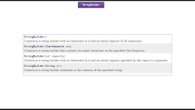 public class StringBuilderDemo { public static void main(String[] args) { /* * Constructs a string Builder with no characters in * it and an initial capacity of 16 characters. */ StringBuilder sb1 = new StringBuilder(); System.out.println("sb1 = " + sb1); System.out.println("sb1 capacity = " + sb1.capacity()); System.out.println("-----------------------"); /* * Constructs a string Builder with no characters in * it and the specified initial capacity. */ StringBuilder sb2 = new StringBuilder(50); System.out.println("sb2 = " + sb2); System.out.println("sb2 capacity = " + sb2.capacity()); System.out.println("-----------------------"); /* * Constructs a string Builder initialized to the * contents of the specified string. The initial * capacity of the string Builder is 16 plus the * length of the string argument. */ String str = "Hello"; StringBuilder sb3 = new StringBuilder(str); System.out.println("sb3 = " + sb3); System.out.println("sb3 capacity = " + sb3.capacity()); System.out.println("-----------------------"); /* * Constructs a string Builder that contains the same * characters as the specified CharSequence. The * initial capacity of the string Builder is 16 plus * the length of the CharSequence argument. */ CharSequence charSequence = new StringBuilder("Welcome"); StringBuilder sb4 = new StringBuilder(charSequence); System.out.println("sb4 = " + sb4); System.out.println("sb4 capacity = " + sb4.capacity()); } }