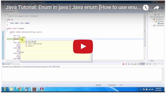 /* * How to use enum & switch statement? */ enum Car { TATA, AUDI, FIAT, HONDA } public class EnumDemo { public static void main(String args[]) { Car car; car = Car.AUDI; switch (car) { case TATA: System.out.println("You choose tata!"); break; case AUDI: System.out.println("You choose audi!"); break; case FIAT: System.out.println("You choose fiat!"); break; case HONDA: System.out.println("You choose honda!"); break; default: System.out.println("I don't know your car."); break; } } }Output