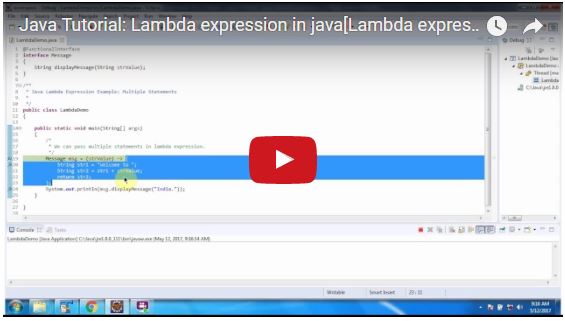 @FunctionalInterface interface Message { String displayMessage(String strValue); } /** * Java Lambda Expression Example: Multiple Statements * */ public class LambdaDemo { public static void main(String[] args) { /* * We can pass multiple statements in lambda expression. */ Message msg = (strValue) -> { String str1 = "Welcome to "; String str2 = str1 + strValue; return str2; }; System.out.println(msg.displayMessage("India.")); } }Output