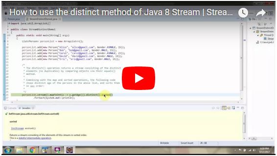 enum Gender { MALE, FEMALE } public class Person implements Comparable<Person> { private String name; private String email; private Gender gender; private int age; public Person(String name, String email, Gender gender, int age) { super(); this.name = name; this.email = email; this.gender = gender; this.age = age; } public String getName() { return name; } public void setName(String name) { this.name = name; } public String getEmail() { return email; } public void setEmail(String email) { this.email = email; } public Gender getGender() { return gender; } public void setGender(Gender gender) { this.gender = gender; } public int getAge() { return age; } public void setAge(int age) { this.age = age; } public int compareTo(Person another) { return this.age - another.getAge(); } @Override public String toString() { return "Person [name=" + name + ", gender=" + gender + ", age=" + age + "]"; } }StreamDistinctDemo1.java
