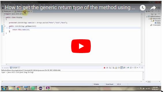 import java.lang.reflect.Method; import java.lang.reflect.ParameterizedType; import java.lang.reflect.Type; /** * How to get Generic return Type of the method */ public class ReflectionDemo { public static void main(String[] args) { try { Class<Display> classObj = Display.class; Method method = classObj.getMethod("getNameList", null); Type type = method.getGenericReturnType(); System.out.println("type = "+type); if (type instanceof ParameterizedType) { ParameterizedType parameterizedType = (ParameterizedType) type; Type[] typeArguments = parameterizedType.getActualTypeArguments(); for (Type typeArgument : typeArguments) { Class typeArgClass = (Class) typeArgument; System.out.println("typeArgClass = " + typeArgClass); System.out.println("typeArgClass Name = " + typeArgClass.getName()); } } } catch (NoSuchMethodException | SecurityException e) { e.printStackTrace(); } } }Output